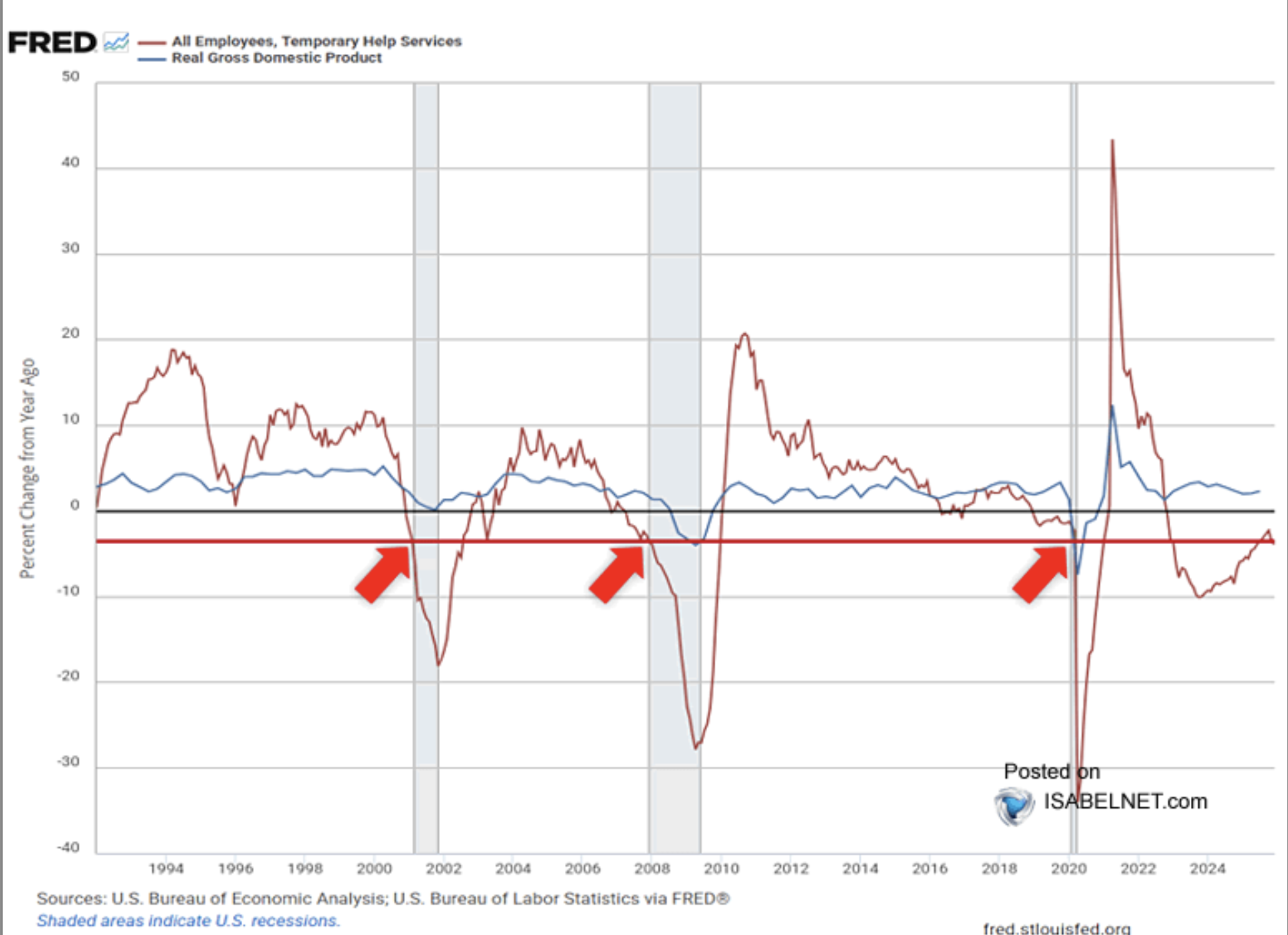 Son veriler, yıllık bazda geçici istihdamda belirgin bir düşüş yaşandığını göstermektedir. Bu düşüş, geçmişte resesyon öncesi dönemlerde sıkça gözlenen kritik eşiklerin altına inmiş durumda. Ancak reel ekonomik büyüme henüz pozitif seyrini sürdürüyor. Yani işgücü piyasasının en hassas bölümü zayıflarken, genel ekonomi bu olumsuz durumu henüz tam yansıtmamış durumda.