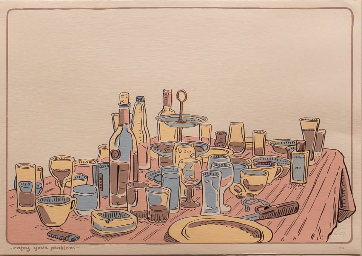 Borderless Editions tarafından üretilen “Enjoy your problems” isimli 2021 serigrafi baskı, 50×70 cm boyutlarıyla dikkat çekiyor. Yapı Kredi Kültür Sanat Loca’da gerçekleşen III. Sanat Dünyamız Film Günleri kapsamında, Vardal Caniş’in sofra temalı resimlerinden oluşan seçki izleyicilerle buluşuyor. Sergi, yemek yemenin sadece fiziksel bir eylem olmadığını; aynı zamanda hafıza, tanıklık ve ilişkilerle örülü bir deneyim olduğunu vurguluyor.